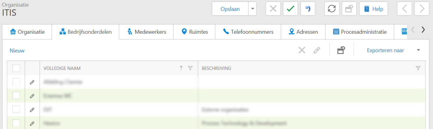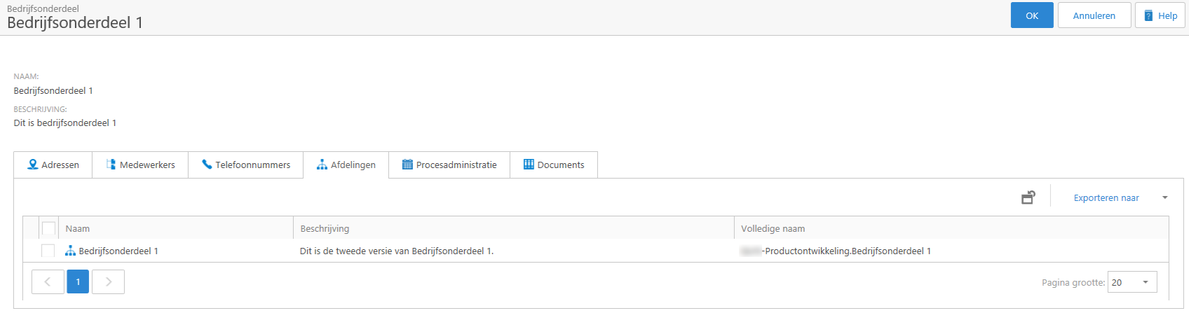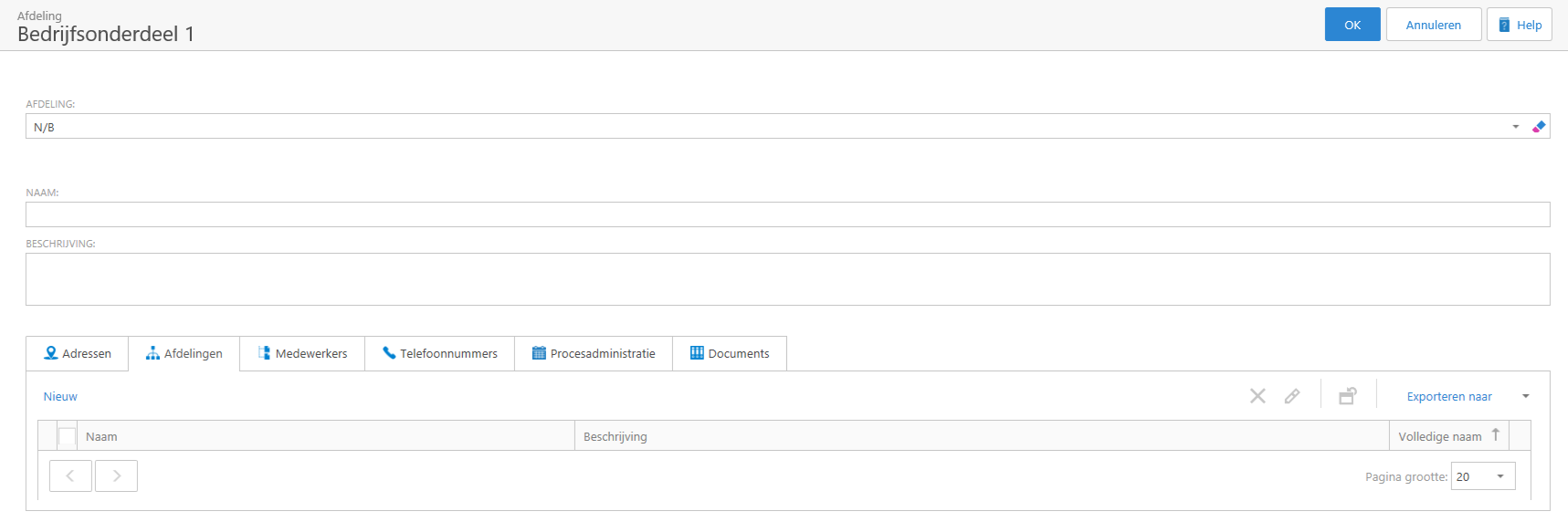You can create new departments to connect to a business unit. To do this, click on the Edit-icon for the newly created business unit in the 'Business units' tab. Make sure you are in the Departments tab. Click on [New]. A new window opens