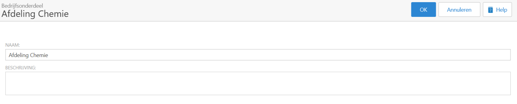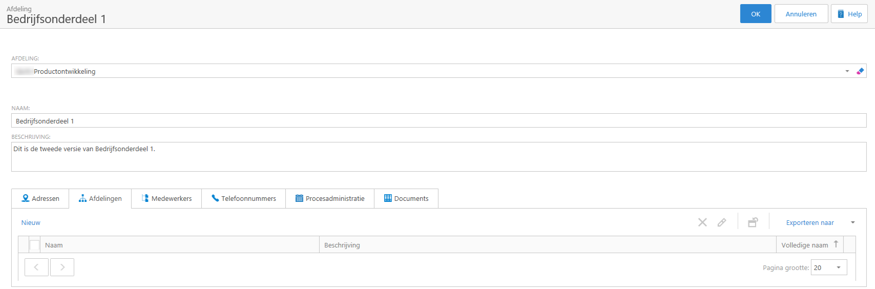 The field at 'Department' is a drop-down window. Click on the arrow on the right, you will get an overview of the departments that have already been created. Select the department to which you want to link the new department, enter the name of the newly created part and click OK.