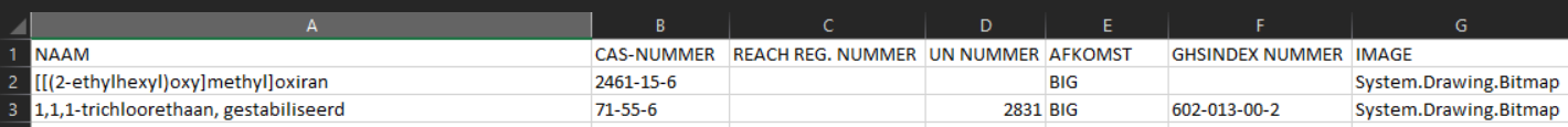 Here is an example of the columns being exported. How the columns are displayed depends on the file format you are exporting to. If you export to a *.pdf file, the columns will be divided over two pages.
