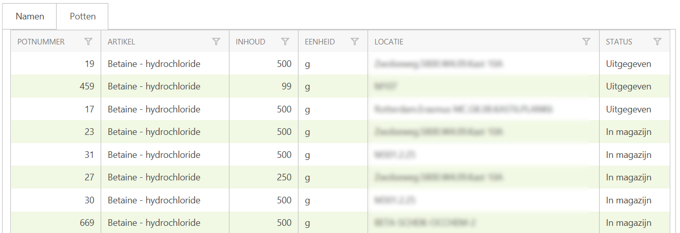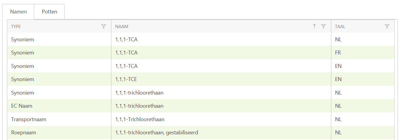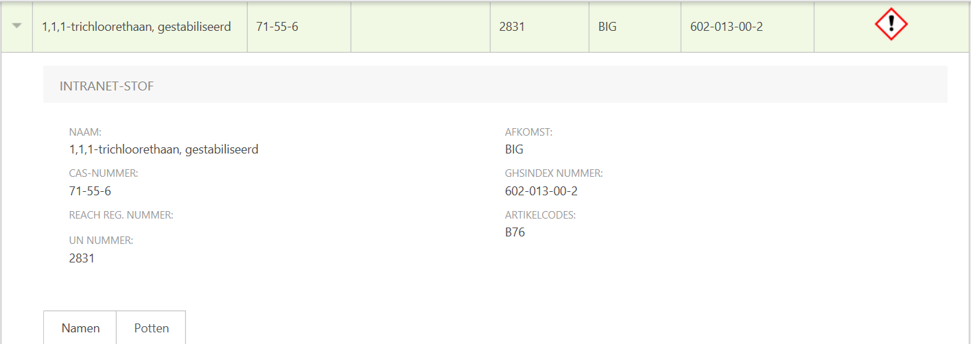 You can see that the arrow next to the substance name has changed direction (). This means that you are now looking in the detail view. In addition to the information you already saw in the grid, you will also see the article code. Below that you will see two tabs: names and pots.